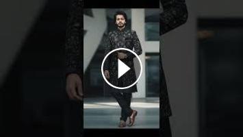 A handsome man wearing a stylish silver.grey embroidered sherwani jacket over a plain silver.grey kurta and pajama with brown loufer, standing confidently.100% same face reference He is standing like a model. He is wearing a branded watch.modern background with soft lighting, elegant and royal fashion photoshoot look, cinematic tone, high detail, full body shot.