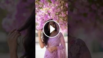 ????????✨️A captivating half-body closeup shot portrait of a young woman (exact face from the uploaded image) posing outdoors, bathed in natural daylight. She is smiling gently, with her head slightly tilted and one hand gracefully touching her dark brown long wavy hair. She is wearing floral chiffon pastel purple saree.She stands under the beautiful overhang of a flowering vine, covered in clusters of delicate lavender/purple Bougainville blossoms, which perfectly complements her.