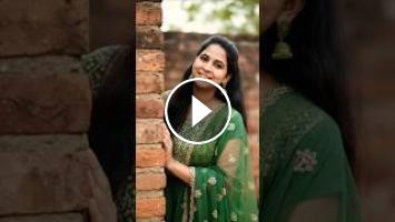 Prompt: A captivating candid portrait of a young woman with a warm smile, peeking from behind a textured brick wall. She has dark, long wavy hair pulled back and is wearing a moss-green, embroidered kurti or dress. She is wearing bright green and gold jhumka earrings. The lighting is soft and natural, highlighting her features. The background is a blurry continuation of the brick wall (bokeh effect) without changing her face exactly same as reference photo she looks slim and young,she wearing matching netted embroidery design shawl