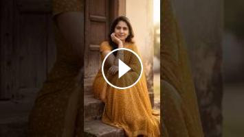 Portrait of a young woman in a mustard-yellow polka-dot sari, seated on rustic stone steps by an aged wooden door. Hand on cheek, soft smile, direct gaze. Cinematic golden-hour light, shallow depth of field, high-detail textures of fabric and wood, editorial lifestyle mood without changing her face exactly same as reference photo she looks slim and young