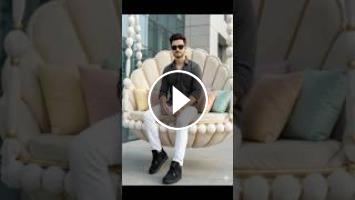 Take a picture of a beautiful and elegant man, A Man wearing soft dark gray Shirt and white pant and air luxury jordan shoes and sitting graceful on a shell- shaped swing decorated with white ball and gold accents, black sunglassesz slim silver bracelet, A little thick gold chain, gold wristwatch with pastel macaroni pillows, in front of modern building.same to same face and Man sitting in confortable and luxury style.
