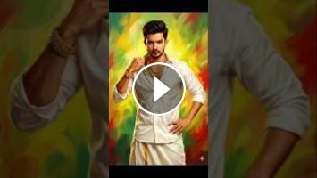 my picture"A stunning digital painting of a handsome and intense South Indian man, reminiscent of a young action hero, wearing a traditional white veshti (dhoti) and a white shirt (sattai). The man has a serious expression, dark, styled hair, and is accessorized with thick, layered gold chains around his neck and a gold bracelet. He is dramatically pulling the collar of his shirt down with his right hand, revealing a glimpse of his chest and the gold chain, while his left hand rests on his hip. The background is a vibrant, abstract, and painterly mix of yellow, green, and red brushstrokes. The artwork style is hyper-realistic digital painting with cinematic lighting."