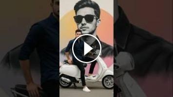 Create a modern fashion campaign featuring me with a split-personality concept. Main full-color figure shitting on white vespa, wearing black pant and navyblue shirt and white shoes. Behind me, a large black-and-white portrait Strit painting facing slightly left, dark sunglasses, calm, mysterious. Light colorfull background with warm circular gradient (soft) stylish without changing my face and DSLR. 100% original and real face form uploaded image.