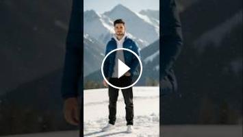 A 20-year-old boy, a fit slim body, standing confidently with one hand in his pocket in a snowy mountain area. He is wearing a blue puffer jacket, a white hoodie, black denim baggy jeans, and white sneakers. The background features soft winter sunlight, light snowfall, and cinematic tones with high-detail snowy mountain scenery and natural shadows.