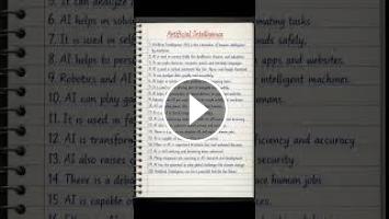 This video presents a 20 lines essay on Artificial Intelligence in real notebook style. It explains meaning, uses, benefits, and effects of AI in simple English points. The essay is written in blue ink with a red heading.