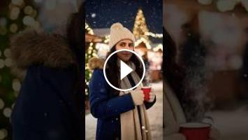 "A beautiful, long-haired young woman(exactly same as uploaded photo) wearing a chunky knit cream colour beanie and matching scarf,bundled up in a fur-trimmed navy colour parka, stands outdoors at a festive night market.She is holding a steaming red mug,looking towards camera, soft elegant makeup look,with soft snowfall gently falling around her.The background is blurred with bokeh lights from Christmas trees and wooden market stalls, creating a warm,cozy.dark brown wavy stylish hair