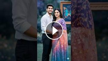 HD portrait of a young couple with identical faces and bodies to the uploaded reference. The man wears a chiffon shirt with black pants, while the woman has long dark hair in a half-updo with braids, wearing a butterfly-colored embroidered net saree, matching bangles, necklace, and long dangling earrings. Her makeup features defined eyebrows, bold eyeliner, and colored lips. The background is an outdoor dark butterfly tone with subtle light reflections and a framed artwork visible.
