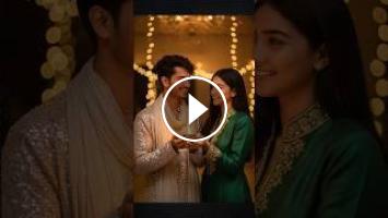 A couple celebrating Diwali, both dressed in traditional Indian attire. The man 100% face match from uploaded image is wearing a shimmering silver kurta with a cream-colored stole, while the woman is in an elegant emerald green outfit with gold embroidery. They are holding a lit diya (oil lamp) together, gazing at each other with smiles, with a warm, out-of-focus background of golden string lights, creating a festive and intimate atmosphere.