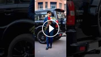"Hyper-realistic 8K hyper portrait of a man (same face, hairstyle, beard, and outfit, 100% match) holding a bouquet of red roses, white lilies, and blue hydrangeas, casually leaning on the rear of a dark black scorpio s11 car. He is checking his watch, wearing stylish rectangular shades, a dark blue suit, a black shirt, and matching formal shoes. The car features black alloy rims and red brake calipers. The man has a handsome look."