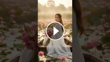 "A dreamy, ethereal portrait of a serene woman sits in a boat surrounded by pink lotus flowers, wearing a delicate white dreamy saree puff sleeve, holding a bouquet of Lotus flowers and gazing over her shoulder with a gentle smile. graceful woman sitting on a boat in a lush pink