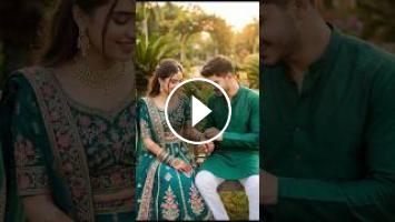 3. My Face should be Same in this A romantic photograph of a South Asian couple sitting together on a wooden bench in a lush green garden during golden hour. The woman, with her hair half-tied, wears a rich teal green lehenga choli adorned with intricate pink floral and gold embroidery, a matching sheer dupatta, gold jewelry including a maang tikka, necklace, earrings, and a stack of bangles on her henna-patterned hands. She smiles softly, looking down. The man, in a matching emerald green kurta and white pajama, sits close to her, holding her hand and gently adjusting her bangles with a smile. The background is a beautifully blurred garden with tropical plants and an archway, bathed in warm, soft sunlight. The image is a candid, full-shot portrait with a shallow depth of field