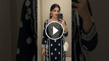 1.Create a realistic mirror selfie of a young Indian woman standing in a modern fitting room. She is wearing a black kurta with intricate white floral embroidery on the front and sleeves, traditional Indian design, long sleeves, elegant ethnic style. She carries a small white shoulder bag with a gold chain strap on her left shoulder. Her hair is dark brown, center-parted, loosely tied back with soft face-framing strands. She wears oxidized silver jhumka earrings, subtle gold necklace, red nail polish, and natural glam makeup with rosy blush and deep red lipstick. She holds a dark smartphone while taking the mirror selfie. Soft indoor lighting, neutral beige walls, clean mirror reflection, realistic skin texture, DSLR-quality photo, sharp focus, 18k high detail, aesthetic composition, candid fashion photography. don't change her face.