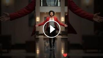 "A stylish young man walking confidently indoors, wearing a bright red blazer over a white shirt slightly open from chest, black slim-fit trousers, and black formal loafers.