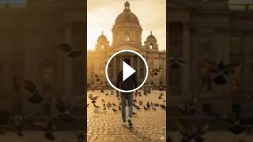 "Low-angle shot of a confident young man standing outdoors with a grand building behind him, sunlight glowing around, pigeons lying, wearing sunglasses and a striped shirt, dramatic cinematic tone"