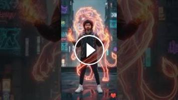 Dynamic cyber-fantasy portrait of a young man wearing a hoodie layered with a denim vest covered in patches, joggers, white high-top sneakers. He stands in an urban rooftop with graffiti walls. His hands ignite with glowing fire, and a fiery neon lion spirals around him, wrapping his body in blazing energy. The lion's design is holographic, luminous red-orange with electric blue highlights. Cinematic urban fantasy aesthetic, VFX, cyberpunk atmosphere.Don't change face