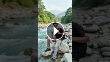16K ultra-realistic portrait of a stylish young man sitting casually on large river rocks beside a fast-flowing turquoise-blue river in a scenic mountain valley. He wears a black t-shirt, grey cargo pants dark sneakers, and sunglasses. Confident relaxed pose with one hand on his shoulder strap natural light highlighting his face and outfit The background shows clear water splashes, smooth stones, and soft green trees on the riverbank under daylight. Cinematic com