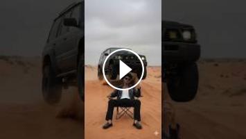 high-action freeze-frame shot of a modified black nissan patrol off-road suv launching into the air off a sand dune. the truck is high in the sky with suspension fully extended, yellow fog lights on, and sand spraying violently from the tires. directly underneath the trajectory of the jumping truck, a man wears white ganji and black leather jacket, rectangular sunglasses, black baggy jeans and a silver chain with voluminous
