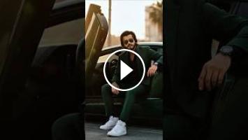 8K ultra-realistic cinematic portrait of a man (same face & beard, 100% match) sitting on the driver's door frame of a dark green Lamborghini with the door open. Cool, confident pose one leg out, arm on steering. Wearing dark green suit, black shirt, white Jordans, and shades. Golden-hour light adds luxury feel. Signature: AN Tech. Keep my face exactly the same. Do not edit my face