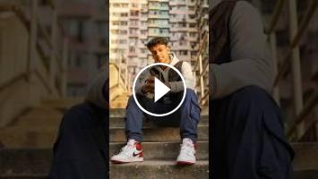 A hyper-realistic 8K portrait of a 20-year-old man sitting casually on outdoor stairs beneath a famous Hong Kong residential building, bathed in warm golden sunlight. He leans slightly forward with an intense gaze at the camera, wearing modern streetwear with Nike Jordans contrasting the rough concrete and railings. Use the exact face from the reference image same features, hair, skin tone, and expression. Low-angle composition, natural bokeh, and golden light create cinematic urban realism with depth and texture.