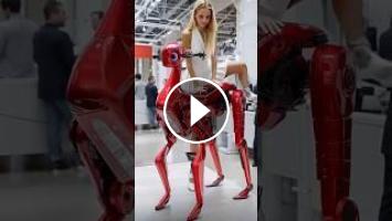 At the Robotics Expo, a young woman takes control of a next-gen AI quadruped robot designed for future personal mobility.