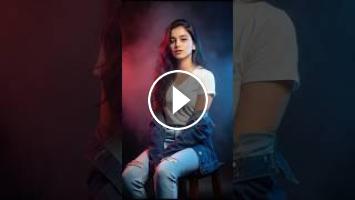 "A young woman sitting confidently on a wooden stool against a dark smoky background with red and blue lighting effects. She has long wavy hair styled to one side, wearing a white V-neck t-shirt, blue jeans, and a denim jacket draped casually over her arm. The lighting creates a cinematic contrast — red glow on one side and blue on the other — adding a dramatic, modern portrait vibe. The background features soft smoke blending with the lights for a moody, stylish atmosphere. Studio portrait photography, sharp focus, realistic skin tones, soft shadows, high-quality Gemini AI photo editing style. I want exact woman same face as, I uploaded no alteration 100% same. Ratio 9:16."
