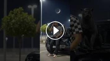 A keeping the same face and hairstyle of 20 years old man with dark, wearing a black and white chack buffer tshirt, black cargo lose jeans, brown-white sneakers, bracelet, chain, wristwatch, Sunglasses on eyes, sitting casually on the hood of a sleek black Defender car side seating black panther. One hand is on their head, the other on the car. The setting is an outdoor parking lot at night, illuminated by numerous
