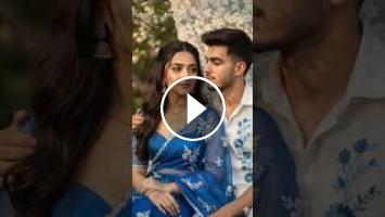Create a dreamy, young couples portrait where warm sunlight filters through lace or floral cutouts, casting magical patterns on the skin. Her makeup is soft and romantic, and her expression is gentle, almost enchanted. She's wearing a sheer cobalt blue white flower paint saree with a matching sweetheart neck blouse and matching accessories. Her long dark brown hair is messy open, and the shadows move as if telling a story. Style:soft glam, feminine, natural. A Man matching outfits.