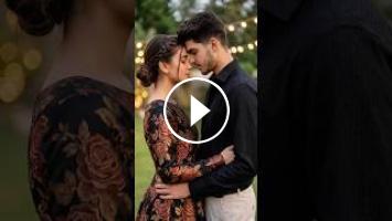 1. A high-quality 8K cinematic portrait of a young Indian couple, inspired by the uploaded photos. They are in a warm, romantic embrace (hugging each other). The man has a stylish haircut and is wearing a sleek black shirt. The woman is wearing a beautiful, elegant floral dress with a deep neckline. The setting is an upscale outdoor garden at twilight, featuring soft golden bokeh lights and warm lanterns in the background. The mood is intimate, celebrity-style, and glamorous with professional studi