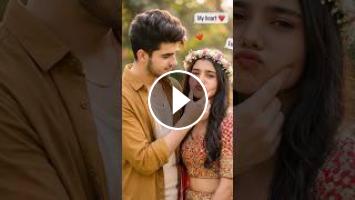Couple in love, the girl making a cute face as the boy holds her chin gently. The girl is wearing a traditional Indian outfit with a flower crown. Boy have voluminous hair and ,he wearing He is wearing a mustard-colored full-sleeve casual shirt with a light inner vest and a thin neck chain. background is blurred, and there are emojis and text overlays like and hearts. The overall style is romantic and sweet, with a focus on their expressions and the soft lighting.