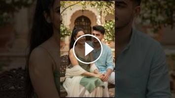A hyper-realistic portrait of the young Indian couples, woman from the uploaded image (Google Gemini refinement), wearing a pastel-dark green sleeveless kurta with thin dhaga straps and a deep scoop neckline that fits tightly to her torso. Her Patiala salwar and dupatta are both matching cream-white. Her high heavy ponytail is slightly damp, with strands clinging softly to her shoulder,with bf