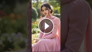Use this face and create a realistic stunning HD portrait of a beautiful young woman wearing a puffy shoulder pink long dress,maching chunri, small pearl tiny earrings,two steps chain with love sign locket, brown eyes, subtle makeup,no bindi, slightly burgundy black highlighting long wavy bouncy hair styled in loose bun,some of hair falling on her face, sitting on her knees gracefully. There will be a white flower on one side of the head, background autdoor.don't change the face.