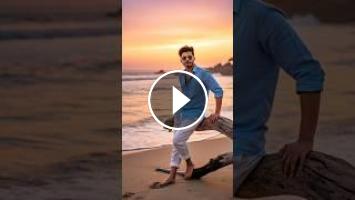 Make my photo like a Hyper-realistic 4K portrait of a 24-year-old indian man (same face & hairstyle as uploaded photo, do not change facial expressions). He leans casually on a large driftwood log at the beach, barefoot, dressed in a light blue linen shirt with rolled-up sleeves, white trousers, and sunglasses. The ocean waves crash gently behind, with the glowing sunset painting the horizon