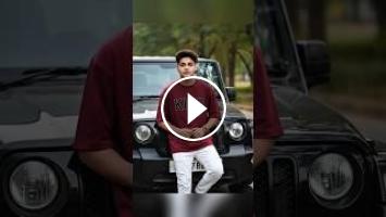 "A stylish young Indian man with a modern hairstyle and a light beard, wearing an oversized maroon t-shirt with the word 'KIND' printed in black, white trousers, and a black watch, leans casually against the front of a black SUV (possibly a Mahindra Thar). He looks directly at the camera with a confident expression. The setting is an outdoor street or park with blurred trees and foliage in the background, suggesting a natural and relaxed environment. The lighting is soft and diffused, highlighting his outfit and the car's details. Don't change the face, make sure the face is the same."