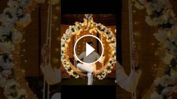Me sitting gracefully on a decorative circular ratta swing decorated with white artificial flowers and lights.The setup has a cozy outdoor Mambiance with bamboo and wicker textures, surrounded by soft and warm yellow Wighting. he wear white salwar and white with yellow color kurta, light natural makeup with a warm smile, posing casually with one leg crossed over the other.