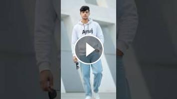 Create an ultra-realistic 8K DSLR-style photo of a stylish young man striking a cool pose. He is wearing a white hoodie with a black Jaikk logo, slightly unzipped at the collar, light sky blue baggy jeans and white sneakers. He is holding black sunglasses casually in one hand. The background should feature abstract, textured white and light-blue structures for a clean, modern look. Make sure the man's face and hairstyle match exactly with the reference photo.