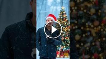 Winter snowfall background, blurred snowy forest, cinematic depth of field. A young man wearing a red Santa hat, black winter jacket and gloves standing in the snow, facing slightly towards the camera with a relaxed smile, one hand in pocket and other hand holding a warm coffee cup close to his chest Beside him instead of an ice sculpture, a beautifully decorated glowing Christmas tree with fairy lights, ornaments and gifts at the base.. Soft falling snow, cool blue tones, natural lighting, high-resolution portrait cozy festive mood