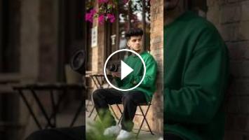 Ultra-realistic 8K portrait of a handsome man (face reference from image) with black, messy, voluminous hair. He's wearing a Bright Green oversized Full Sleeve Rolled up Shirt with a emoji print, black baggy jeans, and white Sneakers. The man is sitting on a chair in front of a coffee shop, leaning casually against a wall while holding a camera lens. He's looking thoughtfully off-camera. magenta bougainvillea branch appears in the upper left, with soft green leaves blurred in the foreground same face normal messy hair